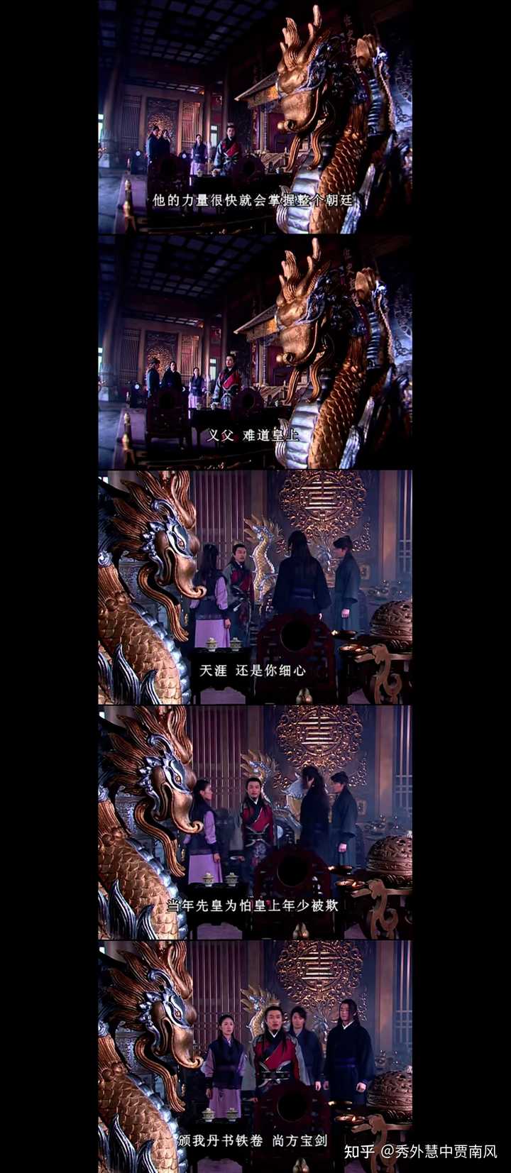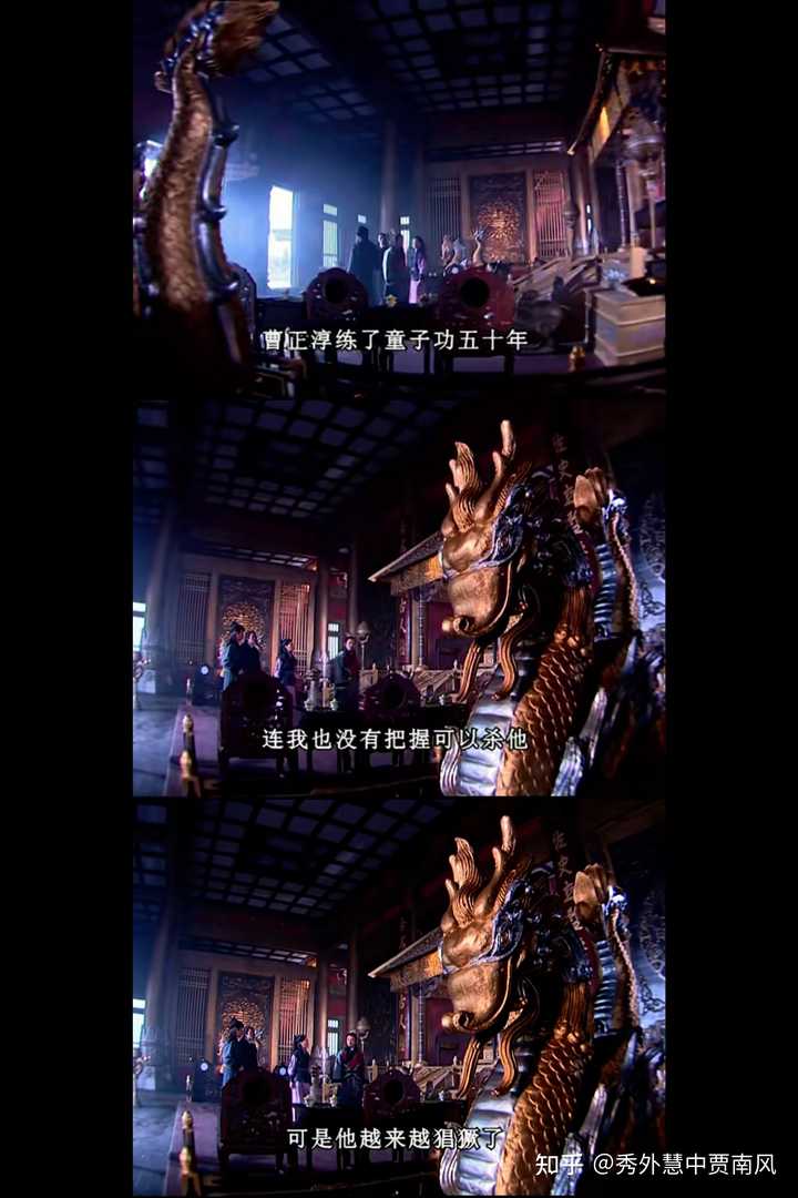 剧组没有直接安排神侯说话来否定上官海棠,而是在海棠说台词的时候,让神侯通过走位,拉开两人关系距离。 再让段天涯上前一步说话,指出问题核心,皇帝放任曹正淳制衡神侯。 神侯再次转身,走向段天涯,即对段天涯发言的认可。 |