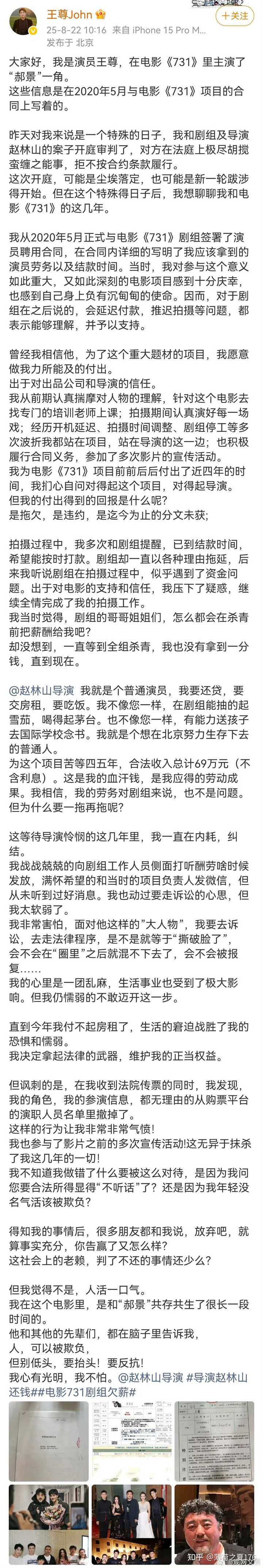 到了8月份,终于拖到拖延战术也不好使的地步,决定定档今年的9月18日,然后各大官媒开始宣传,《731》的上映已然是弦上的箭,不得不发了。 在8月份下旬,又来了一个轰动各大网站的风波。 演员王某称被《731》剧组长期欠薪,赵某却依旧阔绰,抽雪茄,喝茅台,送孩子去国际学校上学,双方已多次协商无果,王尊为得报酬,只好网上维权。 这件事给《731》和赵某的形象又蒙上了一层阴影,更多的人开始怀疑影片的质量和导演的品德。 《731》营销时大谈爱国与民族主义,实际上在做内容时,忽略史实,脑子里一堆黄色废料,拿民族伤痛满足自己对日本女军官与艺伎的XP,在劳务合同的执行上,对同胞的苦难视而不见。 目前王某的讨薪微博已经对外隐藏或者删除,不知道是不是谈妥了? 希望他能拿到被拖欠的报酬吧。 |