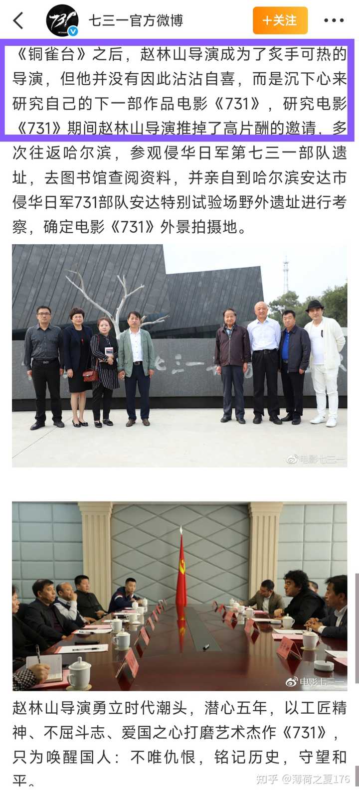 很快就走到了营销和造势的环节。 各种跑电影节啦,开发布会啦,导演“五年磨一剑”啦,微博不关注不能查看全文啦,邀请七三一部队罪证陈列馆馆长当历史顾问啦。 为了还原历史真实性,在《铜雀台》后炙手可热的导演推掉高片酬的邀请(原文就这样),泡图书馆学习历史知识啦。 总之,贴金、营销不能停。 |