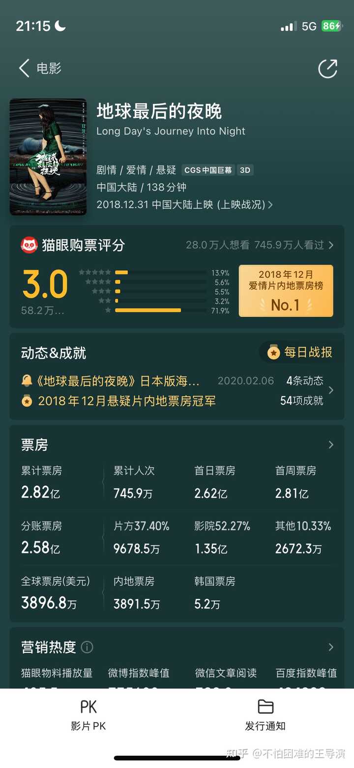 这部电影大家应该还有印象,也是电影宣发的一个极致的教材:单看这个名字,你绝对以为会是一个科幻片,或者浪漫的爱情片,虽然在此之前毕赣导演并没有影响力特别大的电影问世(这是毕赣第二部院线电影作品,前一部是《路边野餐》,文艺到极致的一部电影,投资20万,票房700多万,称得上非常成功了,所以才有了这样第二部大投资的电影),但单看这个名字和海报,就让人有蠢蠢欲动想去看的欲望。 再加上这部电影发行的时间刻意选在2018年12月31日,宣发极力渲染在新年钟声敲响之际,和恋人享受这一年最后的夜晚,简直浪漫至极,极大击中了这群情侣的浪漫神经。所以这部电影获得极大的关注,各种情侣几乎构成了这部电影上映当天的主力观众,大家都满心和自己心爱的人期待一次浪漫的电影之旅。 结果呢?众多情侣一看,这是啥?根本看不懂,莫名其妙的文艺片调调,让很多人都在电影院沉沉睡了,直到电影结束,甚至耽误了这新年之交的一吻。 有多少情侣相互埋怨选错了电影,甚至闹到分手,我们已经无从考究了,但从数据上来说,《地球最后的夜晚》成为猫眼历史评分最低的电影,3.0分。 |