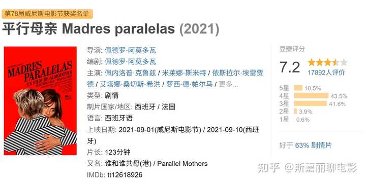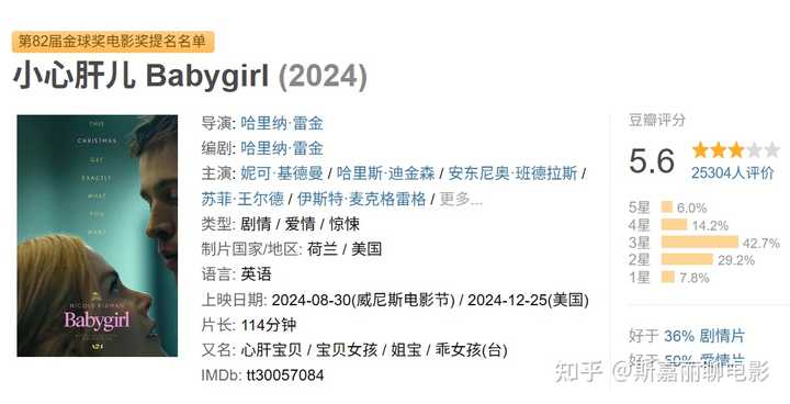 大家的心态肯定是拿奖电影,帮我们长脸了,怎么地也要进电影院看个热闹。 最好的情况就是剧情抓人,让普通观众可以接受。 但是这个可能很小。 如果真的像短视频一样狗血,一样剧情跌宕起伏,拿的应该是奥斯卡而不是威尼斯的奖。 欧洲三大奖,主打一个文艺。 这种文艺,在普通观众的理解上,其实就节奏慢、尺度大,镜头语言很难理解,人物内心静水流深。 如果觉得我说的费解,举几个例子你就明白了。 往年的威尼斯电影节拿过最佳女主角的电影,大家都是有机会看的,但是我列举出来,普通观众看过,且觉得很棒的绝对少之又少。 上一届威尼斯封后之作,是妮可基德曼的《乖女孩》,某瓣翻译成《小心肝儿》,我怀疑很多人就是冲着这个名字带来的遐想去看的,结果,5.6分。 |