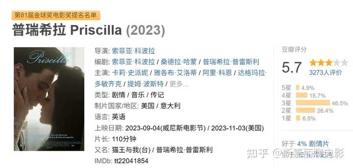 你想想啊,在这个文艺青年和水军混杂的某瓣,这种电影肯定没有水军看的,看的人只有几类: 第一类:妮可基德曼的粉丝。 第二类:文艺青年 第三类:猎奇者。 这个分数,足以说明欧洲三大节的文艺,在我们这,不一定行得通。 再看看前年威尼斯封后的《普瑞希拉》,跟《乖女孩》简直是卧龙凤雏,5.7分。 |