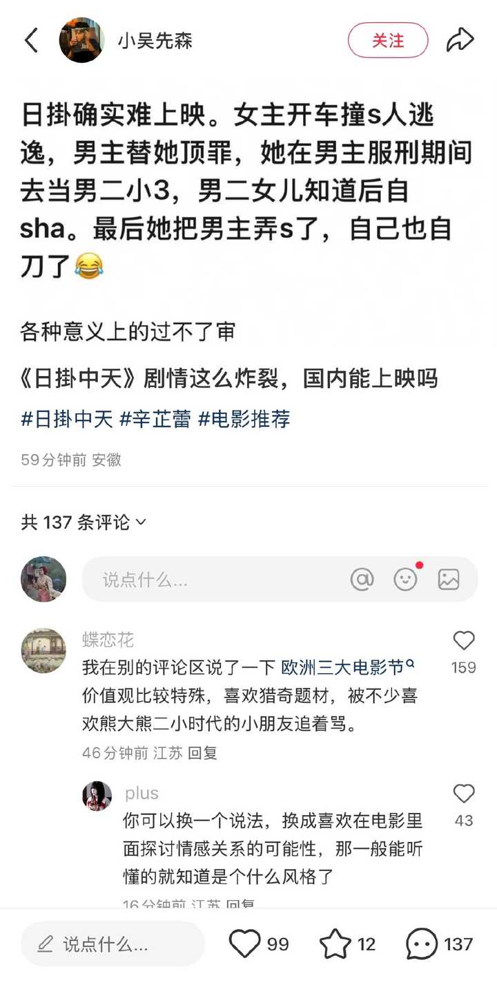 观影评价上,大概率呈现两极分化,欣赏剧情和演技的观众会不吝赞美,但那些抱着过高期待的观众,很可能会觉得影片“沉闷”“节奏慢”“故事性不强”。 这种口碑上的落差,也是文艺片面走进大众市场时面临的普遍现象。 为什么会越写越悲观……个人估计,《日掛中天》的总票房,大概率在1亿至3亿。 |