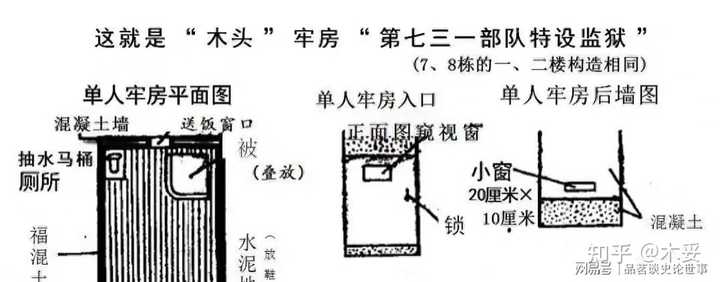 这是来自纪录片《731恶行》,内部是水洗式便池,床是张床垫子 可能是由于遗址的损毁,网上几乎搜不到731牢房构造,更没有找到“做实验的俘虏有专门牢房”之类的资料,除了“牢房是多人间,而做实验的俘虏牢房是单人间” 不论如何,从两者都能看出来,至少监狱里是没有能让俘虏膝盖呈直角坐下的大床的 |