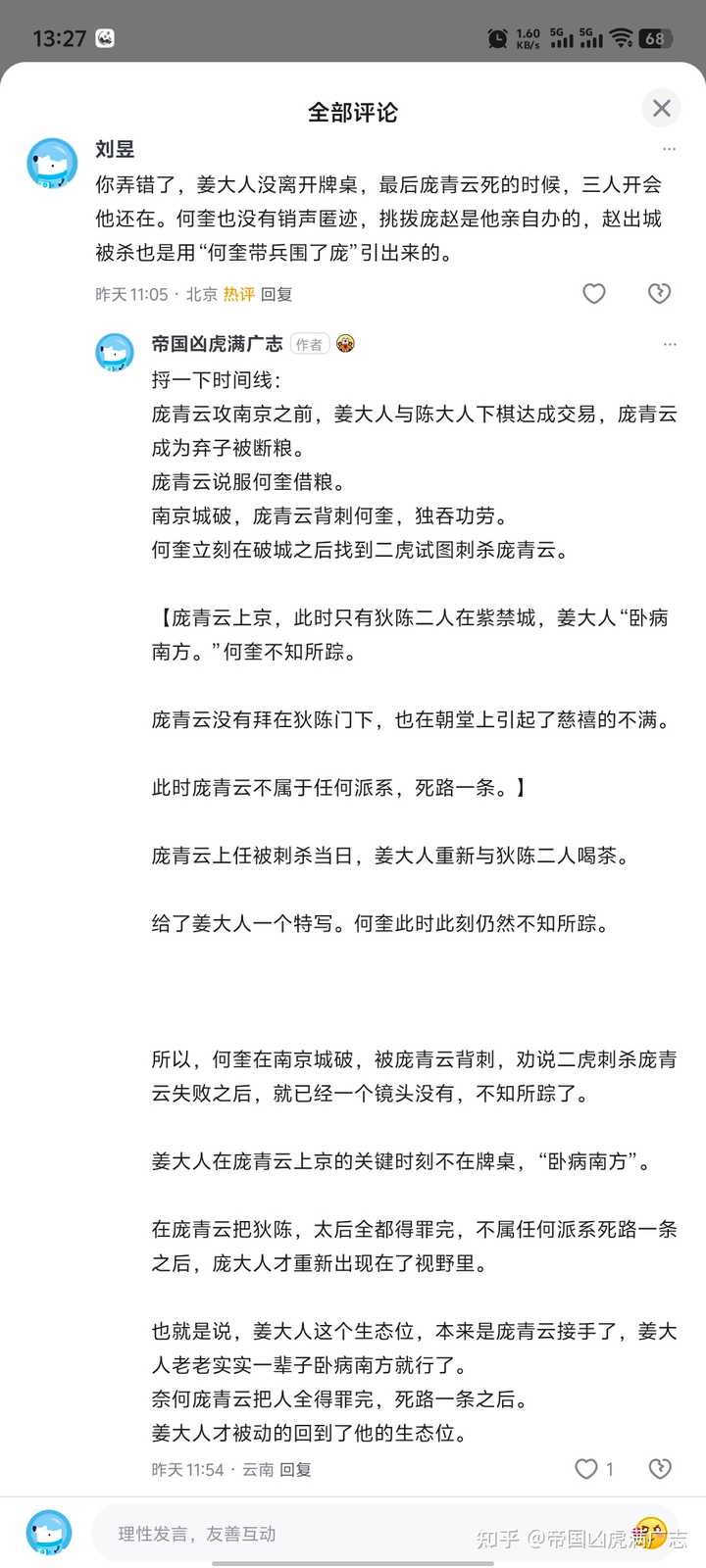 站队?站什么队? 庞青云打南京,三位大人已经判他死刑了,半个馒头的粮草都要不到,连三位大人的面都已经见不到了。 那时候是谁帮的他?给他的粮草? 是何奎。 何奎为什么帮他? 因为庞青云许下承诺,南京城一人一半,功劳一人一半。 最重要的是庞青云说: “你甘心一辈子被这三位大人踩在脚下?” 这句话说完。何奎同意借粮。 何奎宁可违背三位大人的意思,帮助庞青云。 已经说明,在同意借粮的那一刻,何奎与庞青云联手组成了朝堂上与三位大人掰手腕的第四股力量。 “青壮派”。 可惜,庞青云背刺了何奎,独吞功劳。失去了他在朝堂上唯一可能与他有同样利益诉求的铁杆盟友。 没了何奎,庞青云就只能成为棋子,也就注定失败。 补充一下: 为什么最后朝堂上只剩狄大人和陈大人。 何奎的老领导姜大人被“气的卧病南方”踢出朝局。 这就完全证明了何奎的价值。失去了何奎,姜大人就没有了坐在牌桌上的资格。 而失去了姜大人在朝堂的庇护,以及在押宝庞青云被背刺之后。何奎也就只能一个镜头没有,被销声匿迹翻不起一点浪花。 何奎与庞青云,二人合力可以攻下南京。 互相背刺的后果就是,何奎销声匿迹,庞青云死在南京。 评论里还有说何奎会背刺庞青云。我还要再讲一下这一点。何奎从头到尾都是一个养精蓄锐苟到不能再苟的形象,这种人一旦押宝,那就是看准了才落的子。何奎非常清楚违背三大臣私下借粮给庞青云的后果,那就是一次不忠,终身不用。何奎在借粮的那一刻起,就已经和庞青云绑死在一条船上,没有任何回头路可走。 何奎就算要背刺庞青云,那也是在搞死三大臣之后,他和庞青云一山不容二虎之后的事了。 只要三大臣还活着,何奎为了利益就永远不可能去背刺庞青云。 点赞的人太多,我再讲两句好多人说何奎一开始背刺庞青云导致他全军覆没这件事。 片头庞青云率领的清军被太平军坑杀,远处是黄土戈壁的背景。 接下来直接快进到第一次面见三大臣也是最经典的那个镜头。 陈大人先开口:“庞青云,你带了一营兵在鹤川伏击太平军,居然全军覆没?还敢回来” 庞青云对:“何奎带领魁字营在【侧翼掩护】,临阵退兵三十里” 姜大人:“全军都死了,就你一人活着?” 接下来我就展开讲一下。 太平天国那会,一营清兵满配500人。也就是说,鹤川伏击战,庞青云一营兵加上何奎魁字营,共计两营兵,1000人。 根据电影镜头得知地形,黄土戈壁,远处有残破土墙。 正常来说伏击战,己方兵力达到敌方的1/2或者1/3就够用了。如果是险地关口,人还能更少。 而伏击战的首要条件在于【信息不对等】,攻敌不备。 朝廷派两营兵去戈壁这种开阔地打伏击,远处有残破土墙做依托。那么太平军,满打满算2000-3000人。 而在剧中得知庞青云主攻,何奎侧翼压阵掩护。那么太平军只会更少,在1500左右已经是极限。 500人打1500的伏击,还有500队友在侧翼压阵。 怎么看都不可能输,更不可能全军覆没。 但是剧中庞青云被杀的全军覆没,何奎临阵退兵三十里直接跑了。 那么可能会有几种情况 1.庞青云战前侦查不到位,没侦查到敌军实际人数。但是剧中背景又是黄土戈壁,大股人马很难躲过斥候。 2.敌军人数正确,庞青云手下的兵不给力,第一波没杀崩对面,反被包饺子。 3.敌军人数不明,庞青云就纯傻子一波莽上,去指望何奎跟他一起上。 以上几点,再结合魁字营临阵退兵三十里。以及剧中庞青云之后几场战役的赌徒式打法。 可得出结论: 庞青云战前侦查失利,没有掌握敌军确切人数。第一波伏击就掉了链子,没把太平军打乱,甚至马上就被包围。何奎在旁边压阵,如果想背刺庞青云独吞功劳,那么大可以等庞青云和太平军两败俱伤的时候直接杀上去就行了。 但是何奎没有,直接退兵三十里。足以说明,庞青云这一营兵下去一点水花都没溅起来就没了。就剩魁字营500人对上已经有防备的一千多太平军。 何奎又不是傻子,所以才直接跑了。 …………加更………… 很多人可能跟这位兄弟有一样的误解。我把时间线捋一下就明白了。 |