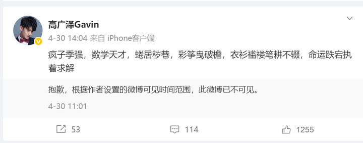 5、带着上一条这个疑惑,去翻了翻季强饰演者高广泽的微博: 衣衫褴褛笔耕不辍,命运跌宕执着求解。 |