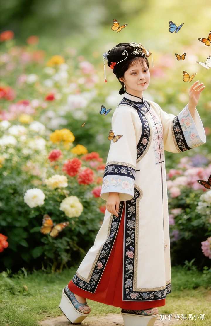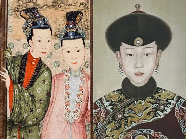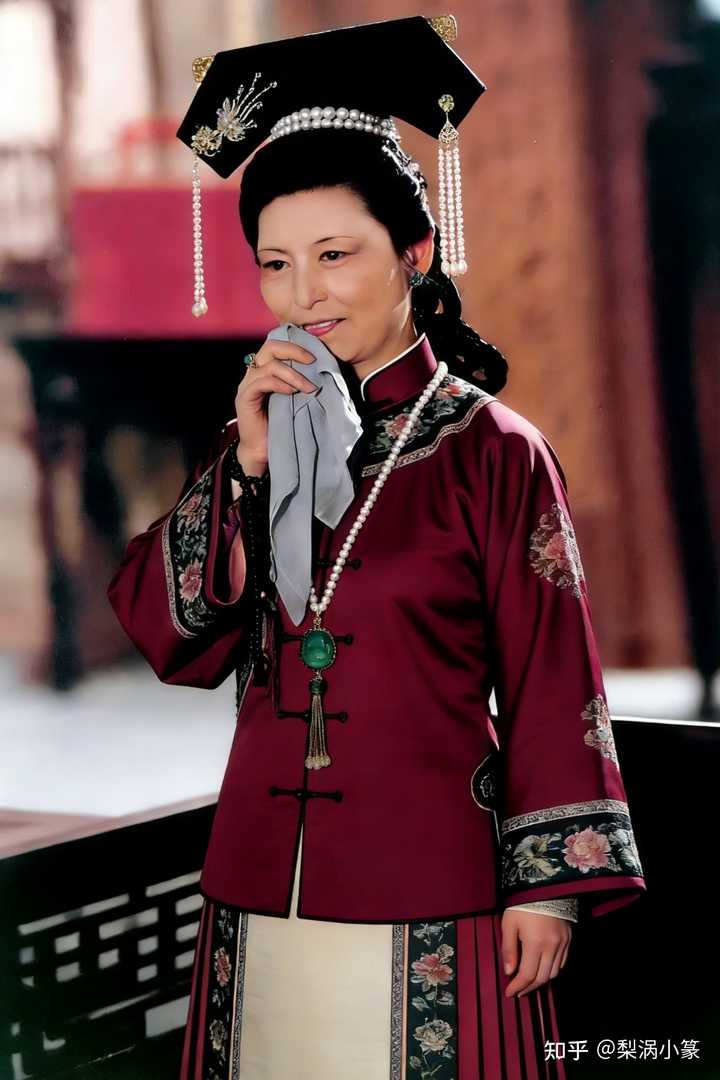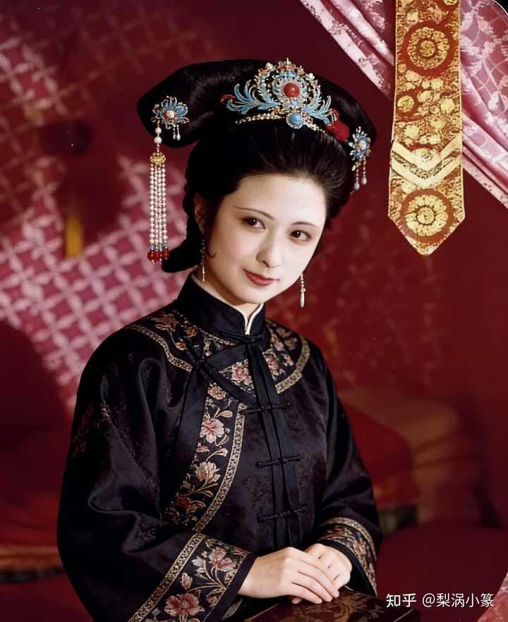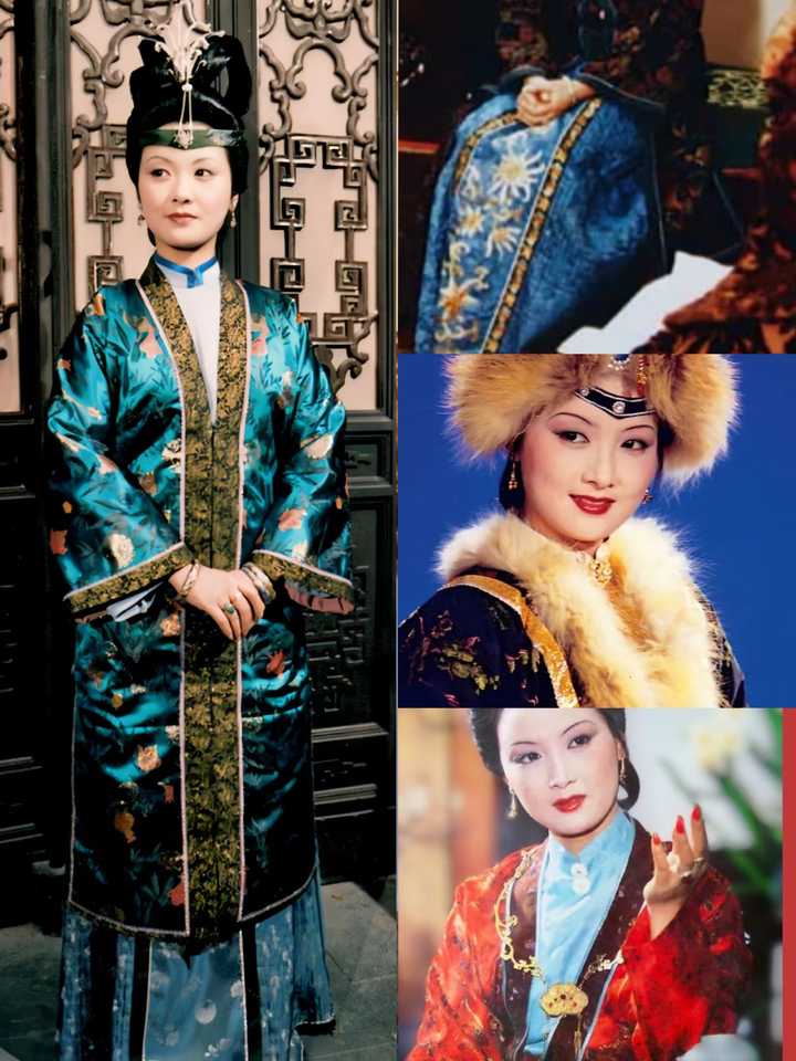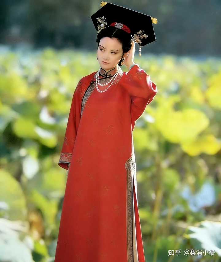 实际上的令妃:左图为汉族常服造型,制式仍是明制,对襟直袖披风+明制立领长衫;右图为旗装礼服造型,这才是厂字领,而且这种宽缘边密绣花厂字领飞入寻常百姓家是晚清的事,早期满族妇女常服是斜襟布扣的素净圆领衫袄(袷袍),华丽化之后才开始照着礼服抄装饰特点 |