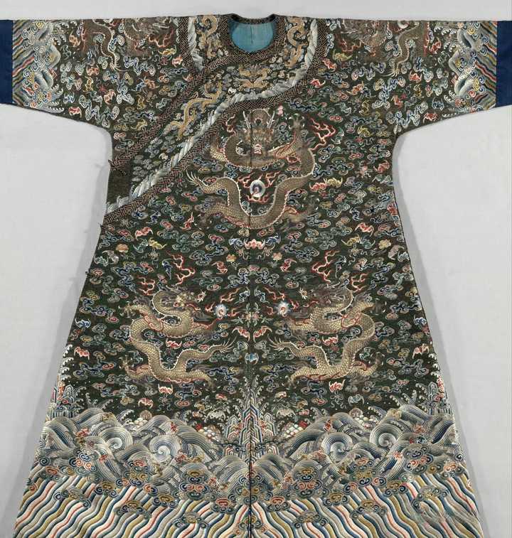 清乾隆 缎绣孔雀羽地云龙纹吉服袍 这个精致繁复到极致了,可是层次感不够,美感很一般。 |