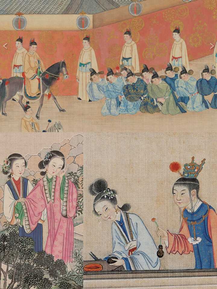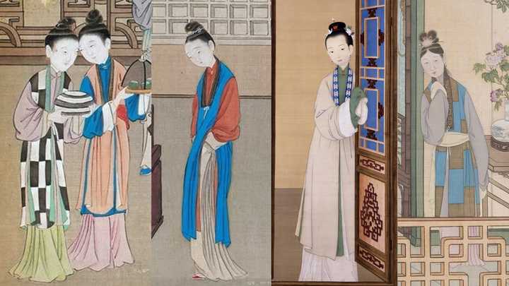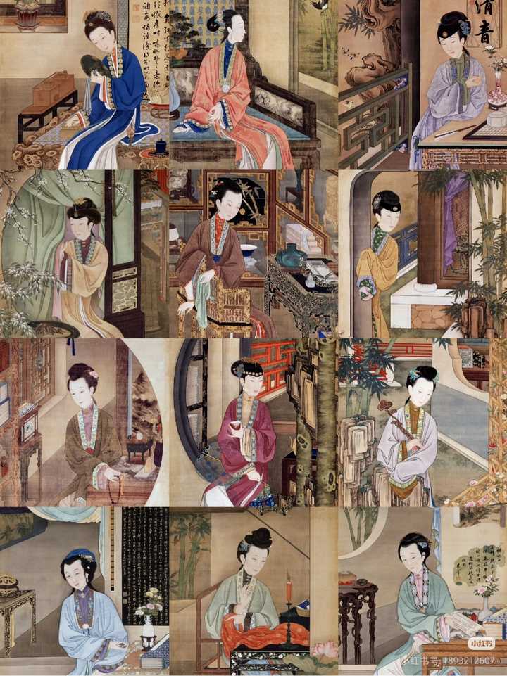 注意袖子和发型的变化 雍正和乾隆年间的袖型基本全是直袖,在此基础上,装饰风格发生了一些变化。延续“苏样”晚明风的清初服饰是很素的,如上图,雍乾年间开始装饰领口与袖缘,并且风格比较有辨识度。前面发过的令妃画像是一例,下面还有雍正十二美人图、乾隆时期零散仕女图和乾嘉年间的随园女弟子雅集图。 |