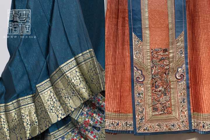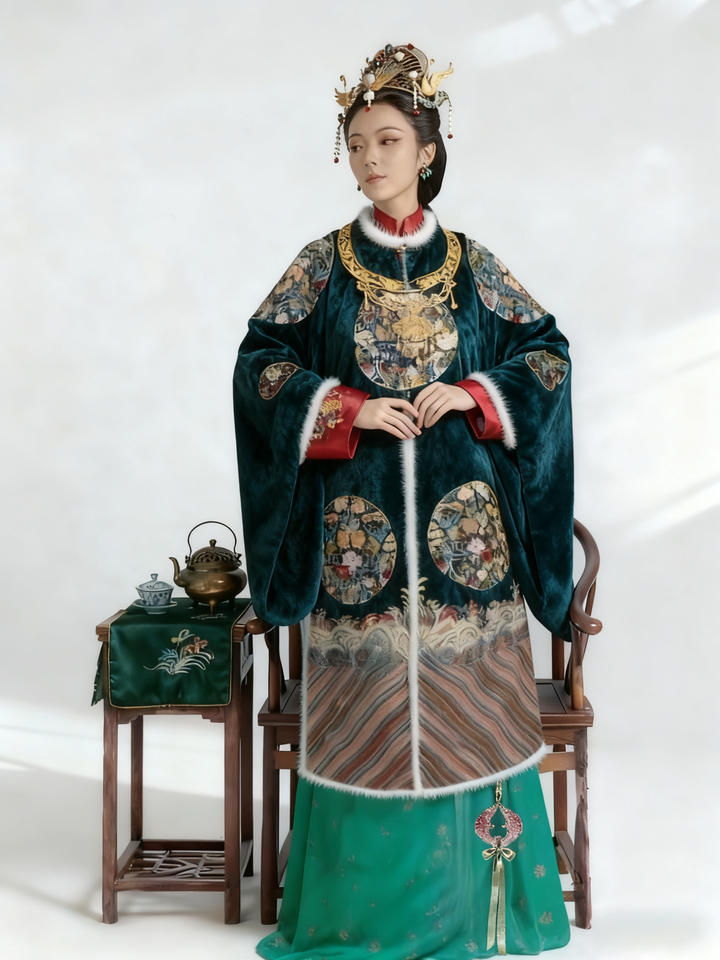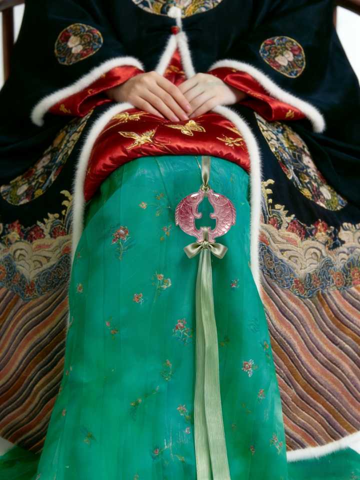凤姐里边穿立领衫,搭着缘边为清中期风格的直袖外衣,配的马面裙全是只装饰裙门的清马面(阑干裙) |