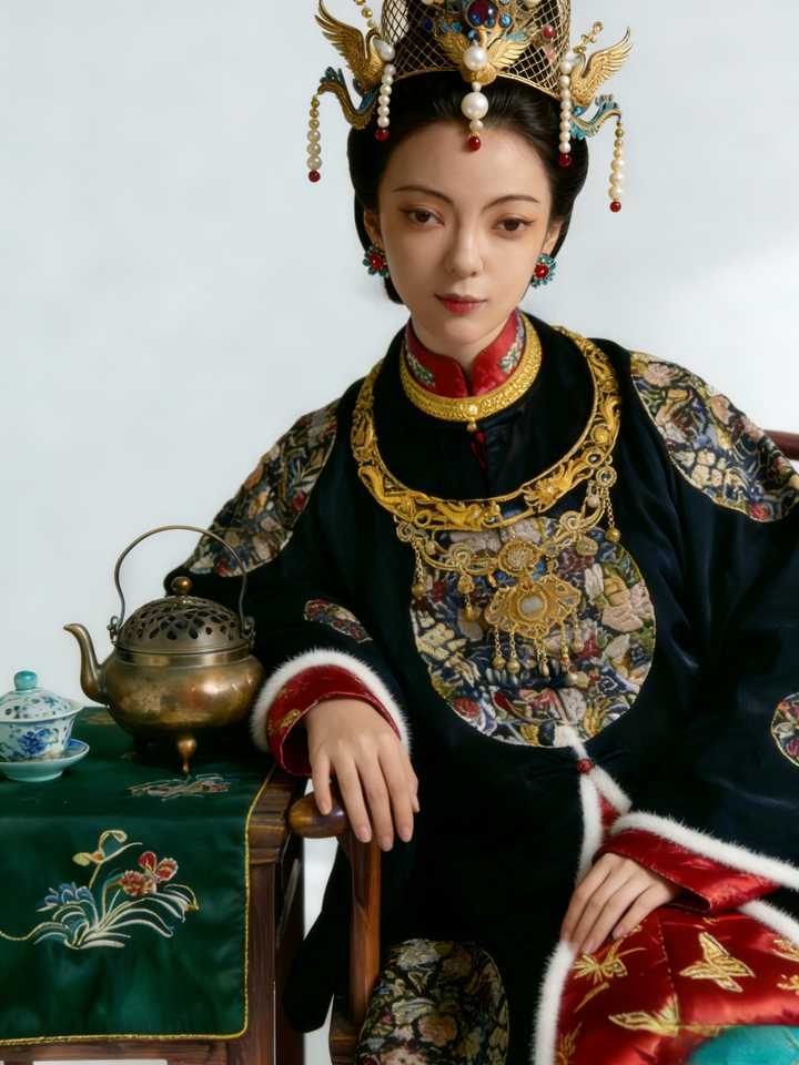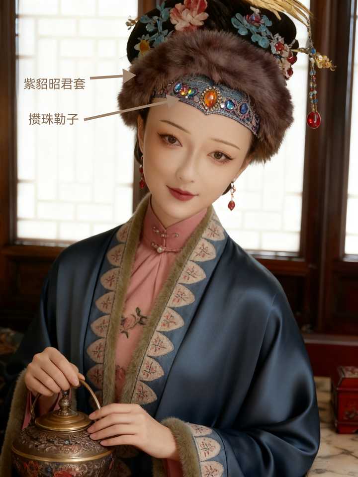 然后吧,总觉得有点怪怪的。这一身每一样都是严格按照资料复原的。总觉得这个石青褂和其他服饰有些不协调。 |
