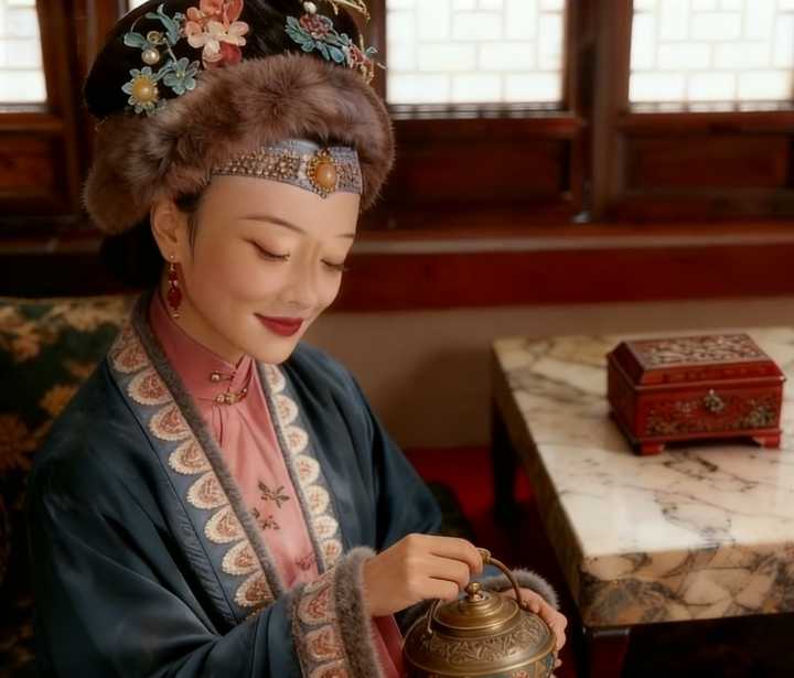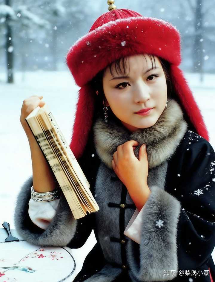 这是史湘云,按照书里提及的“(她)穿着贾母与他的一件貂鼠脑袋面子大毛黑灰鼠里子里外发烧大褂子,头上带着一顶挖云鹅黄片金里大红猩猩毡昭君套,又围着大貂鼠风领。”如果设计成旗装,你们看看有没有富贵逼人的感觉? |
