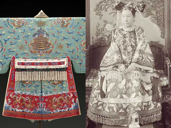 左图为清朝道士法衣(法衣是男装中少有能沿用明制的,但装饰风格已经完全不一样),右图为慈禧太后,都有“排穗”。除此之外它在戏曲服饰上也常见。 |
