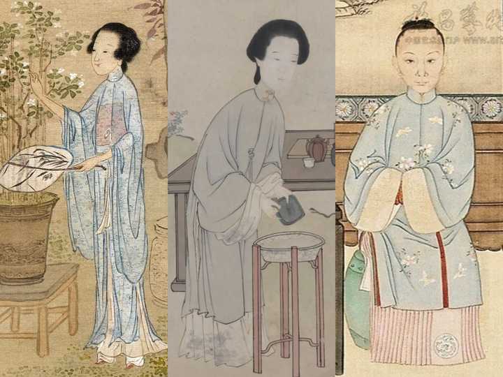 电视剧里的令妃:左《还珠格格》、中《如懿传》、右《延禧攻略》,左中两个大拉翅已经大到伪满洲国的程度了(请参考婉容照片),而三套衣服则全都是清代后期的厂字襟旗装,尤其是最右宽缘边+大量绣花的装饰风格非常晚清 但是十八世纪的明制女装也绝对不等于明代女装。服饰潮流的变化是非常快的,古今中外都如此。明代服饰自己的历史也能分出N截——我自己就是正德-嘉靖服饰爱好者,明前期缘襈袄我不穿,成化大蓬蓬裙我不穿,弘治超短上衣配窄长裙我不穿,晚明“苏样”超长上衣巨大袖子我不穿,“京样”极繁主义袄裙我还是不穿,我精神正嘉人就喜欢琵琶袖中长衣配个窄底襕马面裙,还爱穿男装(男装没有女装那么善变,但袖子放量、外摆幅度、装饰风格、礼制规范等等还是挺方便断代,明朝后期也出现了前期没有的许多款式)。清朝时尚也能掰成N截,与此同时欧洲女装也在这两百年里整出了巴洛克裙、洛可可裙、帝政裙、克里诺林裙、巴斯尔裙、爱德华裙等大不相同的款式。 那十八世纪的汉族女装有什么特点?康熙前期汉族女性时尚基本还是晚明风格,流行高髻(明末有三绺头、松鬓扁髻,清初有牡丹头),衣服是非常夸张的宽袍大袖,有一些形制上的细节变化(比如,晚明大袖衫多数收祛,也就是只有伸手腕出来那一截不闭合,下面是缝死的,而清初流行整个敞口的,但两边都有反例,只是趋势如此)。进入十八世纪,也就是康熙后期,敞口直袖又逐渐取代了敞口大袖(轮回了一下明初的潮流袖形),发型则不再是蓬松款了。 |