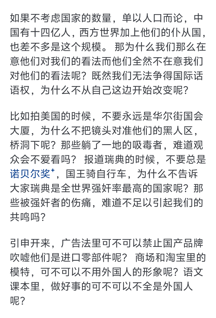 我本来没觉得怎么样…… 被这种言论一说,突然觉得我们好牛逼。 我们好像真的不需要外国…… 我们随便狂欢一下,就这么牛逼吗? 所以怕什么啊? 其实任何一个企业,一个电影,电视剧,只要让中国人开心了,他就是全世界排名前几的顶级…… 根本不用考虑外国人的感受……只服务好中国人就行…… 被这种论调搞的我都要飘了。。 真的觉得我们可以干翻全世界了。 你看,问题是中国人自己啊,我们自己就这么牛逼 |
