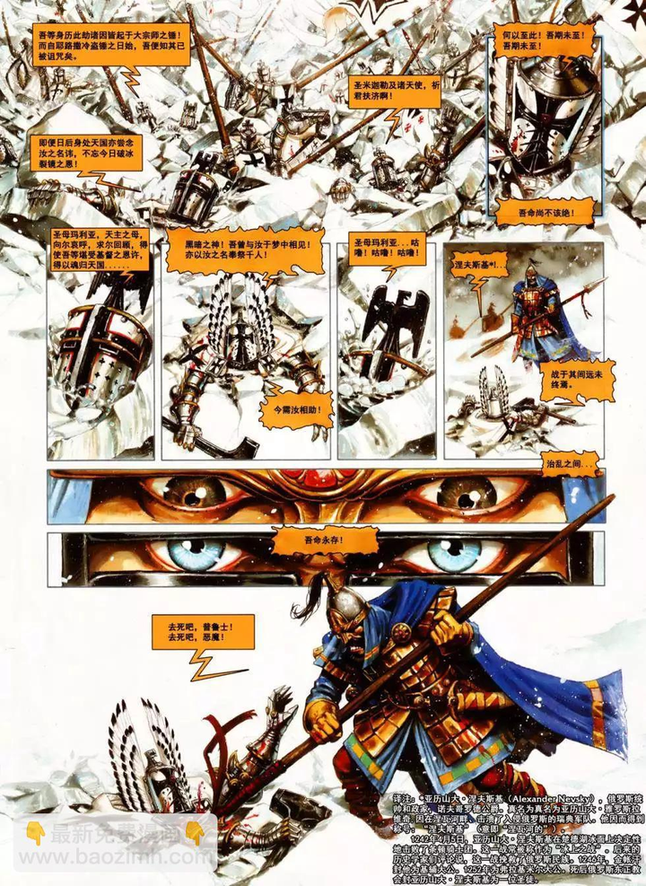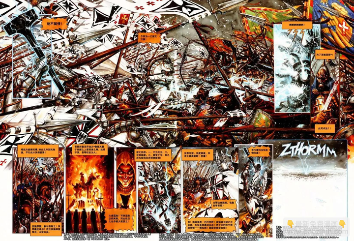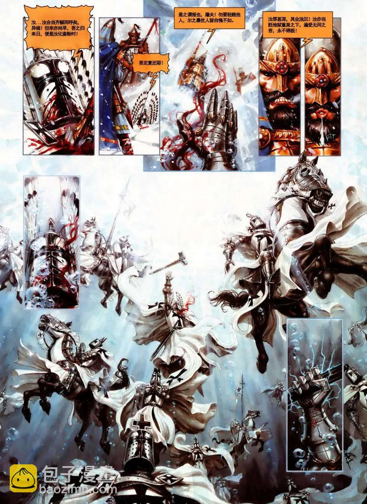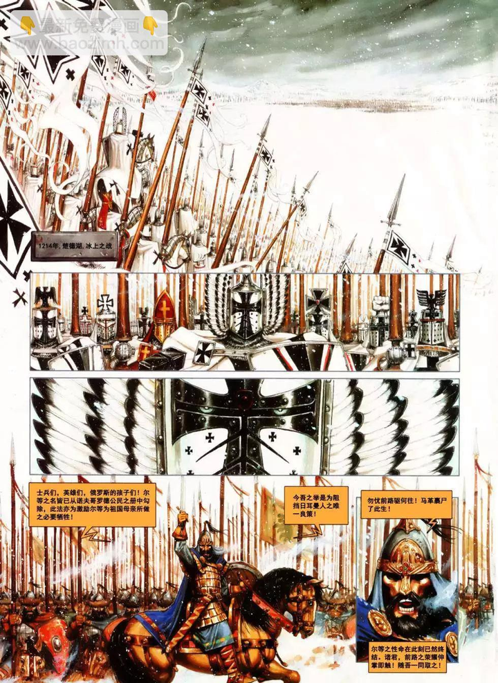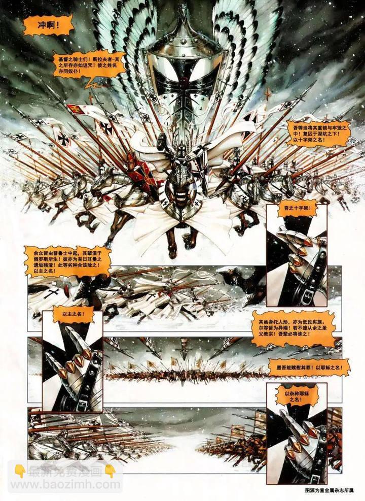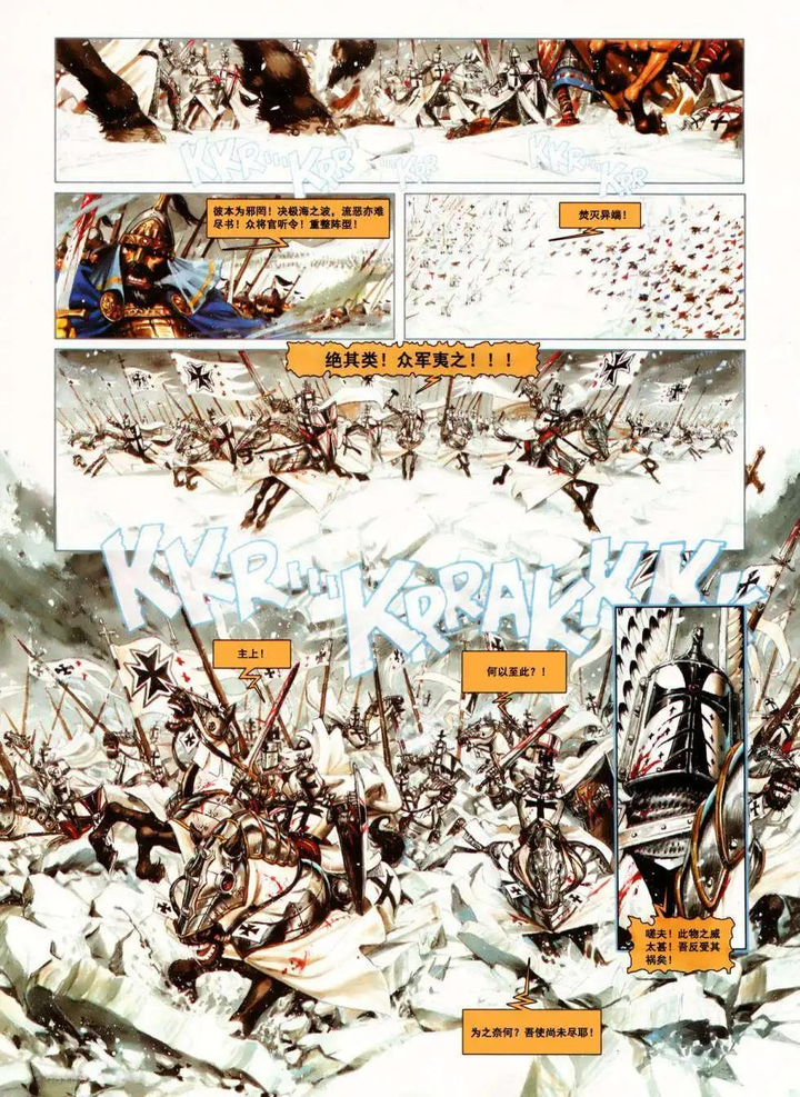 再介绍一本国内非常冷门,但是在国际上非常有名的英法合著漫画《镇魂曲:血腥骑士》(Requiem: Chevalier Vampire)。这是吸血鬼黑暗奇幻,主要故事场景都发生在与正常世界颠倒的地狱,主角是二战德国坦克兵转世成吸血鬼骑士。 上面的名场面就是1242年4月5日(漫画中不知为何写成了1214年?1214年诺夫哥罗德共和国的领袖亚历山大·涅夫斯基公爵还没有出生),条顿骑士团的利沃尼亚支系宝剑骑士团,和诺夫哥罗德共和国在楚德湖上爆发的战役,一般叫做楚德湖战役或者冰湖战役。双方在楚德湖冻结的冰面上展开决战,之后条顿骑士团陷入包围。身陷重围又无法发挥冲击力优势的德意志骑士们惊慌失措,而冰面也在此时不堪重负开始破裂,许多德意志骑士连人带马地落入水中,冻死和溺死者难以计数。看到己方的精锐骑士溃败的场面后,尚未参战的骑士团雇佣步兵开始溃逃。混乱之中,诺夫哥罗德人获得了楚德湖之战的胜利。手持魔法战锤的骑士就是主角的另一位前世,这是关于他的回忆。 这一系列漫画的画工极其精细华丽,远非同期一般的日漫或者美漫可及,骑士、盔甲、战马、战旗,各种细节都栩栩如生。特别是最后一幅骑士们落入冰湖的画面,被刻意画成了天国降临的效果,形成了强烈反差。画师Ledroit的画风被誉为哥特漫画巅峰,血与光影的极致对比。 |